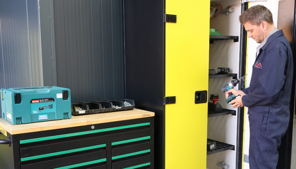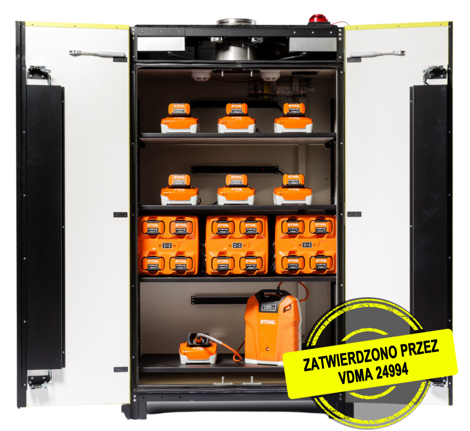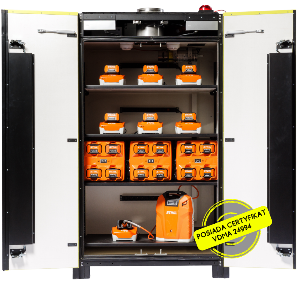 Szafa baterii LOXXER VDMA została specjalnie zaprojektowana do bezpiecznego przechowywania i ładowania baterii litowo-jonowych.