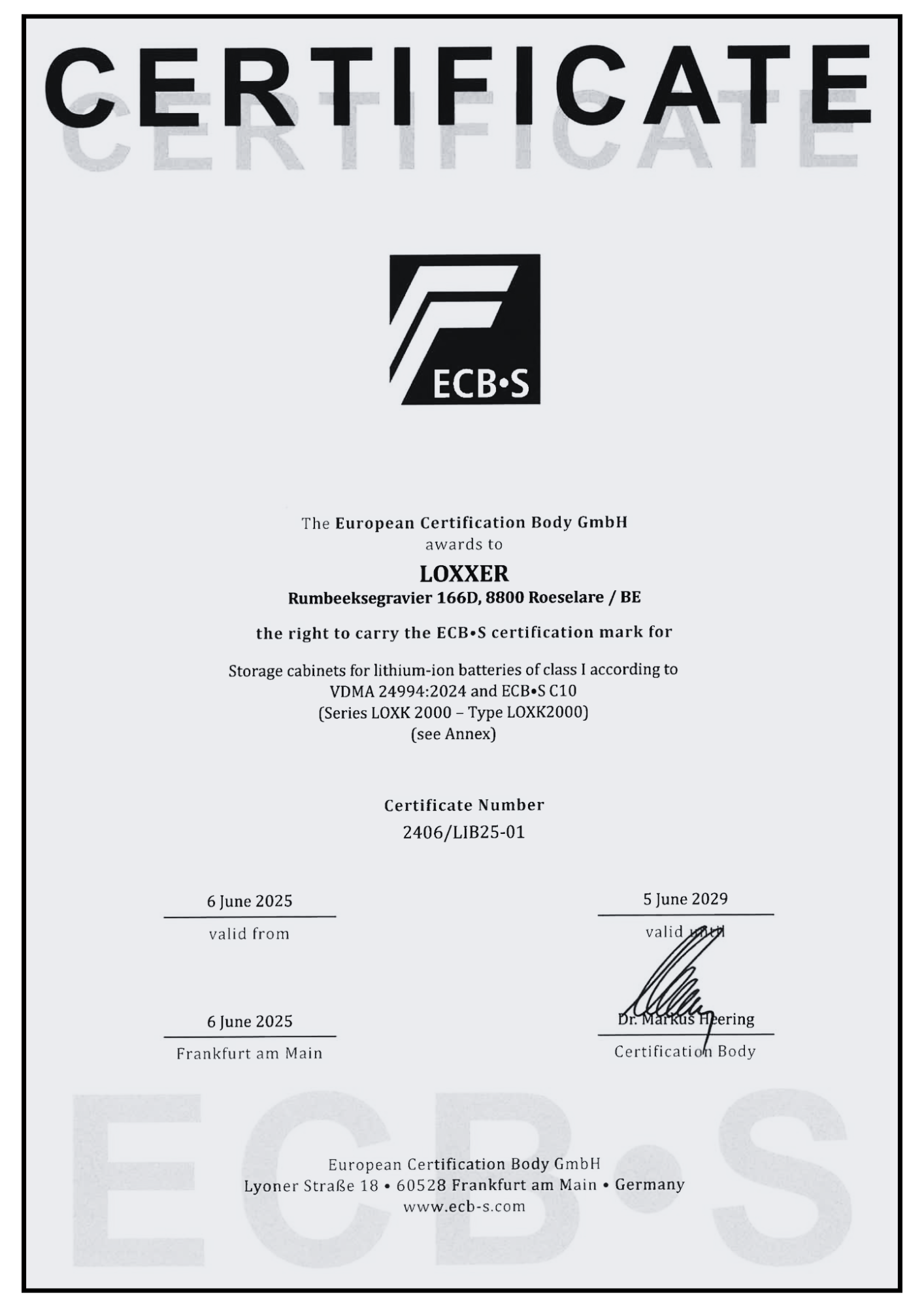 LOXK2000 VDMA posiada certyfikat zgodności z normą VDMA 24994, wiodącym standardem w zakresie bezpiecznego przechowywania i ładowania akumulatorów litowo-jonowych. Certyfikat ten jest uznawany przez ubezpieczycieli, straż pożarną i inspektorów bezpieczeństwa, co czyni go kluczową gwarancją bezpieczeństwa przeciwpożarowego i zarządzania ryzykiem.