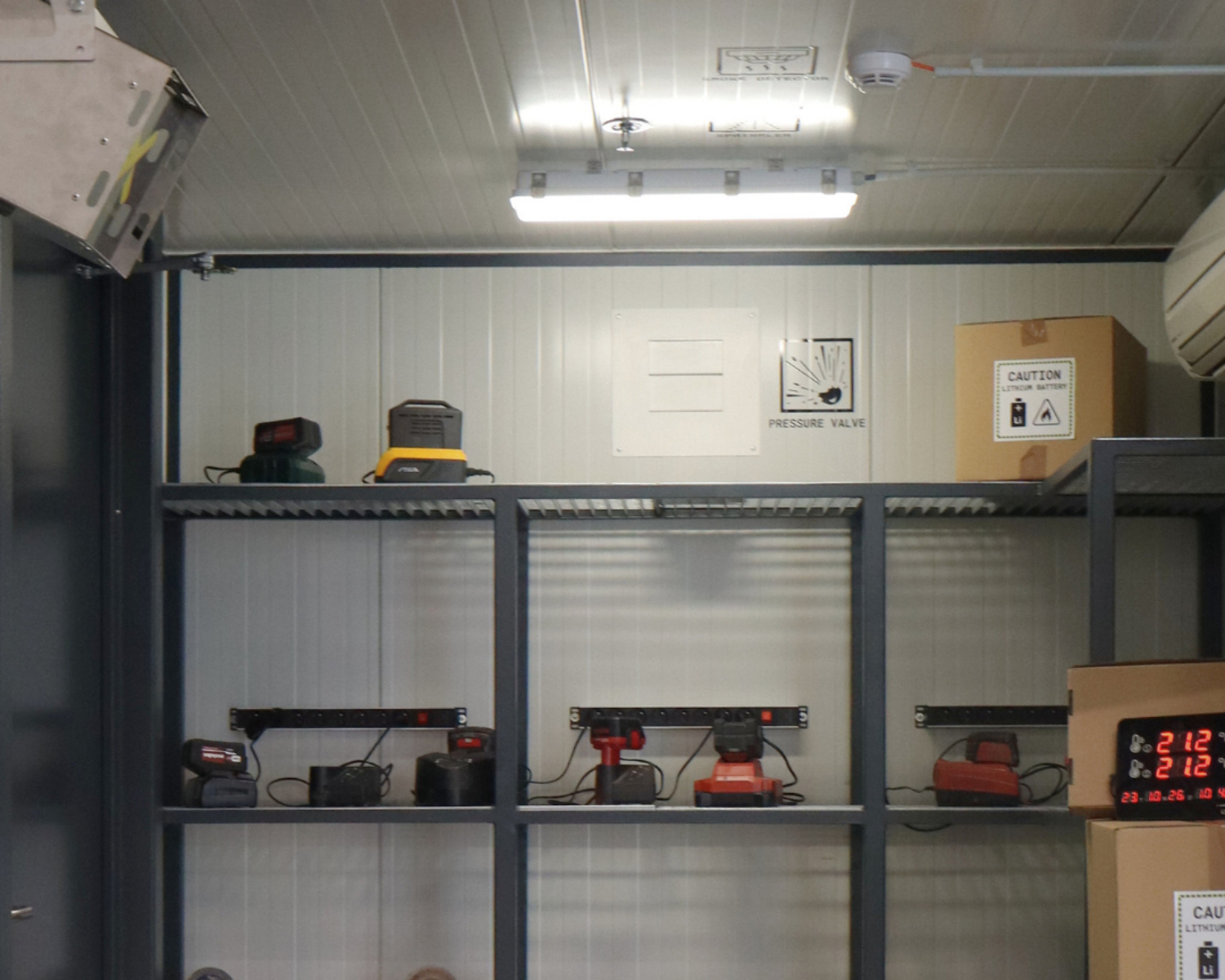 Kontenery Walk-In zapewniają wysoki poziom bezpieczeństwa podczas przechowywania baterii litowo-jonowych. Konstrukcja kontenera oraz zastosowane systemy ochrony przeciwpożarowej pozwalają ograniczyć ryzyko pożaru i jego skutków, a zintegrowane systemy detekcji umożliwiają wczesne wykrycie zagrożenia.