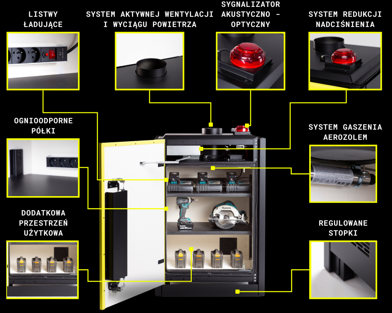 Szafa ognioodporna LOXK1100 została zaprojektowana do bezpiecznego przechowywania oraz ładowania akumulatorów litowo-jonowych w pomieszczeniach wewnętrznych, w których baterie są wykorzystywane na co dzień i muszą pozostawać łatwo dostępne. Model ten sprawdza się w środowiskach roboczych, gdzie istotne jest uporządkowanie procesu ładowania akumulatorów oraz ograniczenie ryzyka pożarowego bez konieczności wydzielania osobnych stref technicznych.
