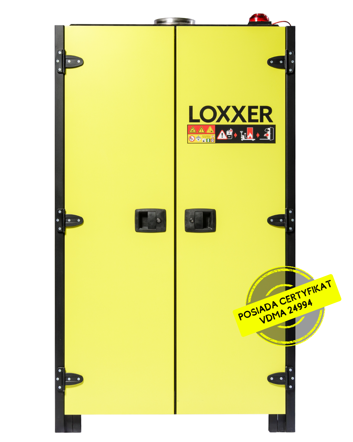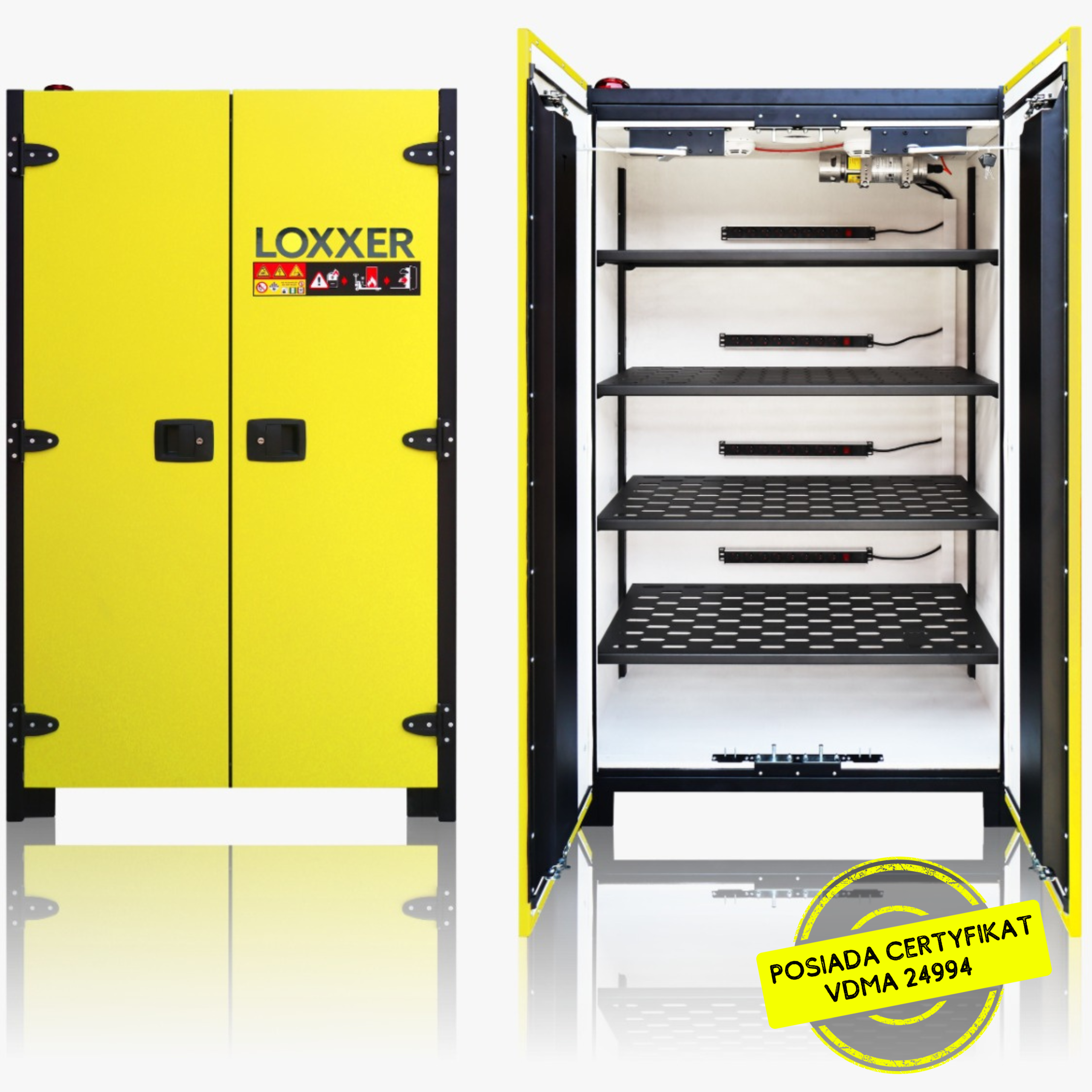Szafa LOXK2000 VDMA została poddana rygorystycznym testom zgodnie z normą VDMA 24994, opracowaną przez niemieckie stowarzyszenie branżowe VDMA jako wytyczną testową dla szaf do baterii litowo-jonowych. Podczas testów baterie litowo-jonowe są celowo doprowadzane do przegrzania, aby zweryfikować skuteczność konstrukcji szafy w warunkach rzeczywistego zagrożenia pożarowego.