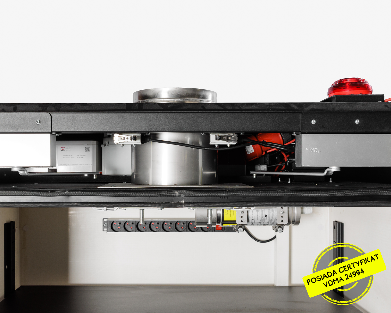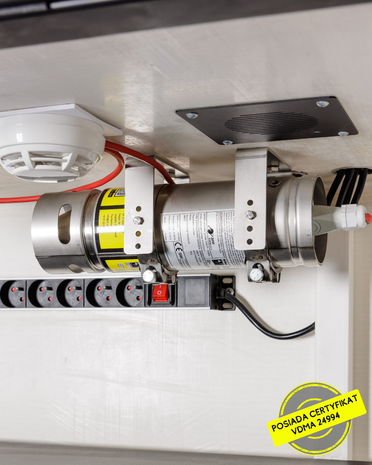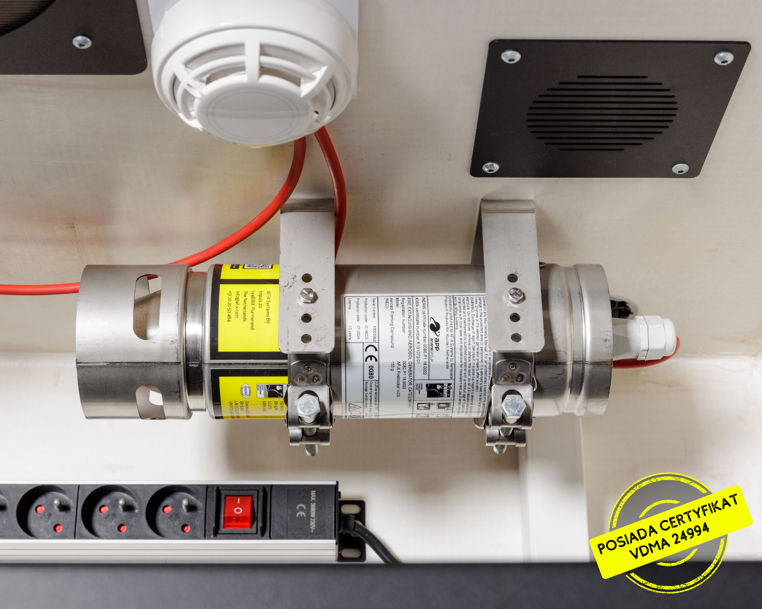 Certyfikat VDMA potwierdza odporność konstrukcji szafy, jednak LOXXER oferuje rozwiązania wykraczające poza standardowe zabezpieczenia pasywne. W przeciwieństwie do rozwiązań, które jedynie izolują pożar do momentu całkowitego spalenia wszystkich baterii, szafy LOXXER mogą zostać wyposażone w certyfikowany system gaszenia aerozolowego.