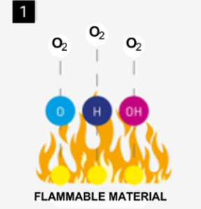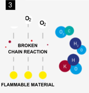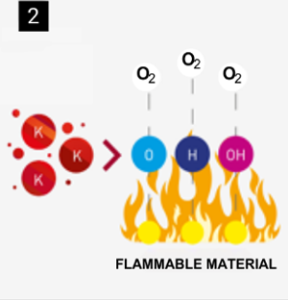 • reakcja chemiczna – aktywne składniki aerozolu reagują z niestabilnymi rodnikami powstającymi w trakcie spalania, tworząc stabilne związki chemiczne. W rezultacie proces spalania zostaje przerwany i nie może być dalej podtrzymywany.